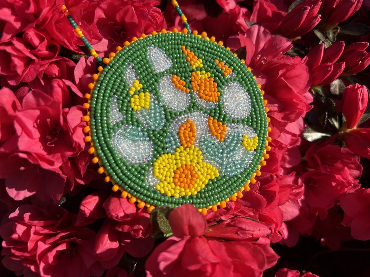 Bear paw medallion beaded in yellow, green and orange with flowers. The simple chain is approximatly 35″ long.