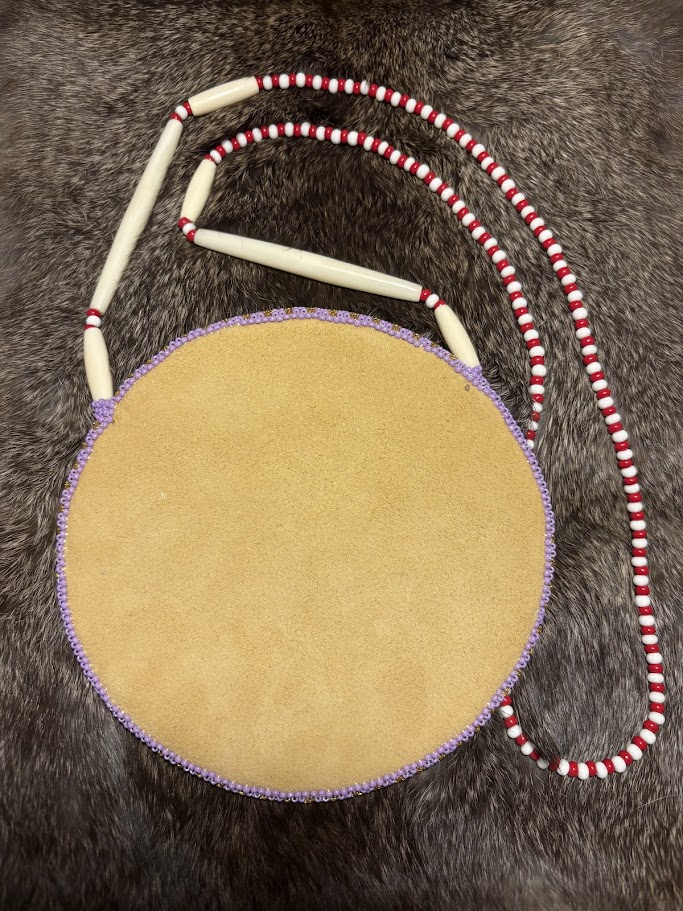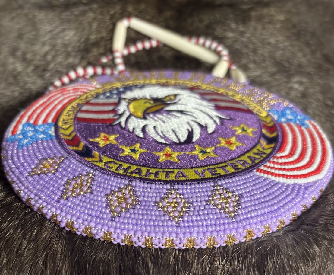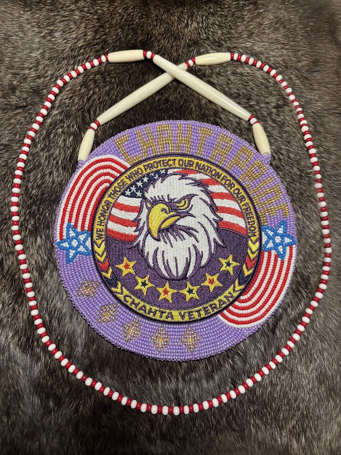 This beaded medallion has the new Veterans Patch for the Choctaw Nation of Oklahoma. This is probably the largest of my medallions todate measuring 5 7/8″ wide! I also did a peyote edging instead of my normal simple style of edging and the chain is made with a mix of beads and bone hairpipe and measures right at 36 inches long.